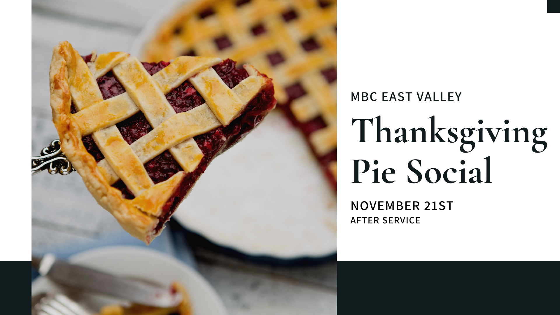 Our second annual pie social is right around the corner. Be sure to hang out after service for fellowship. This event is a great opportunity to meet some new people! If you are interested in learning how you can volunteer or bring a pie, fill out the connect card!
